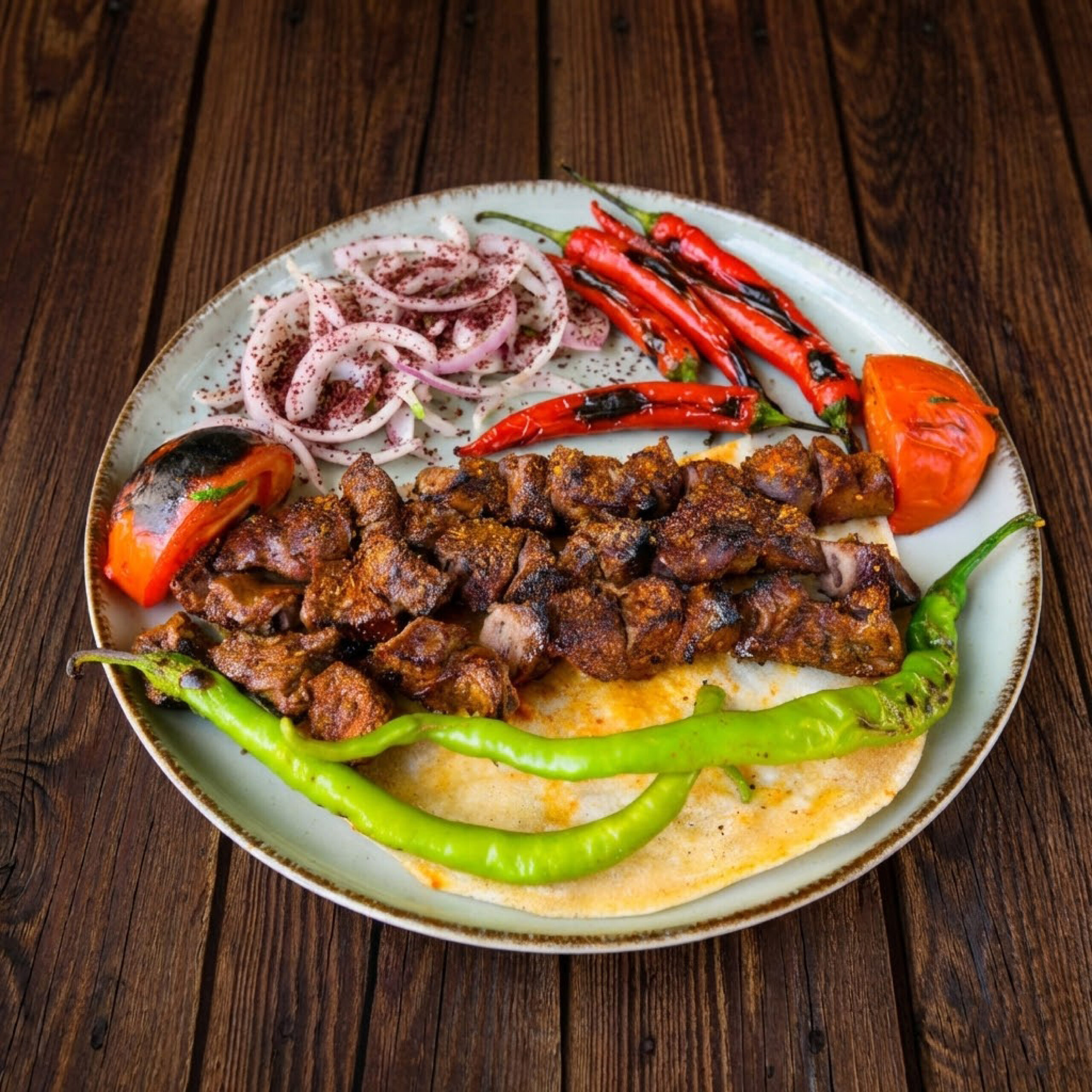 10 şiş, 200-220 gr., közlenmiş domates ve biber ile servis edilir.